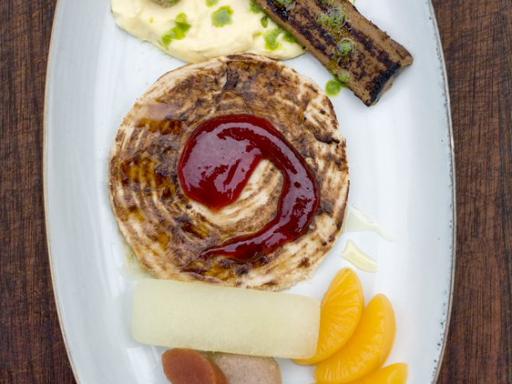 Andesteg med brune og hvide kartofler, skysauce, rødkål, æbler med ribsgelé og agurkesalat (gratin)
