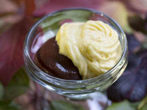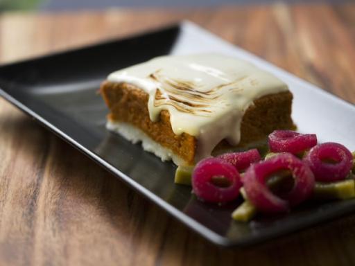 Medister med gule ærter, rugbrød, syltet rødbede og sennep (gratin)